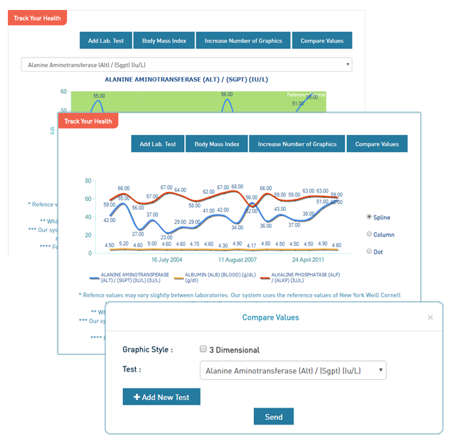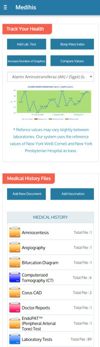 Le logiciel intelligent de Medihis vous permet non seulement de garder un enregistrement de tous vos documents médiaux, mais également de profiter d'un diagnostic anticipé et de services de médecine préventive. Grâce à des graphiques et tableaux comparatifs de vos résultats de laboratoire, suivez vos progrès en vous basant sur les gammes de référence et comparez différents résultats de tests.